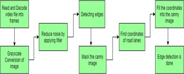 We employed methods like the Canny Function and the OpenCVpackagetoachieveedgedetection.Then,usinga zero-intensitymask,weusedthebitwisemethodto map our region of interest. Then, the image's straight lines and lane lines were located using the Hough Transform technique. Since Cartesian coordinates did not provide a sufficientslopeforvertical andhorizontal lines, weused polar coordinates instead. To display lane lines, we finally combined the original image with our zerointensityimage.