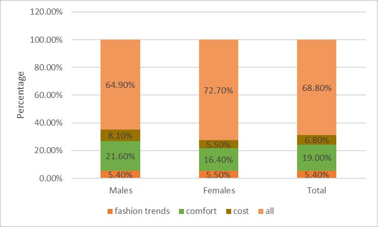 Kuruvilla,S.,Joshi,N.andShah,N.(2009)foundthatwomen hadamorepositiveattitudetomallshoppingandthatthey purchase fashion related categories more often than men. Similarly,inthepresentstudyasinFigure.3,itwas found found that women preferred to buy more fashion related itemsascomparedtomenwhereasmenpreferredcomfort more than fashion. Higher percentage of men preferred comfort whereas higher percentage of women considered fashion trends, comfort and cost. However, there was no significant association of gender and factors determining choiceofshopping.