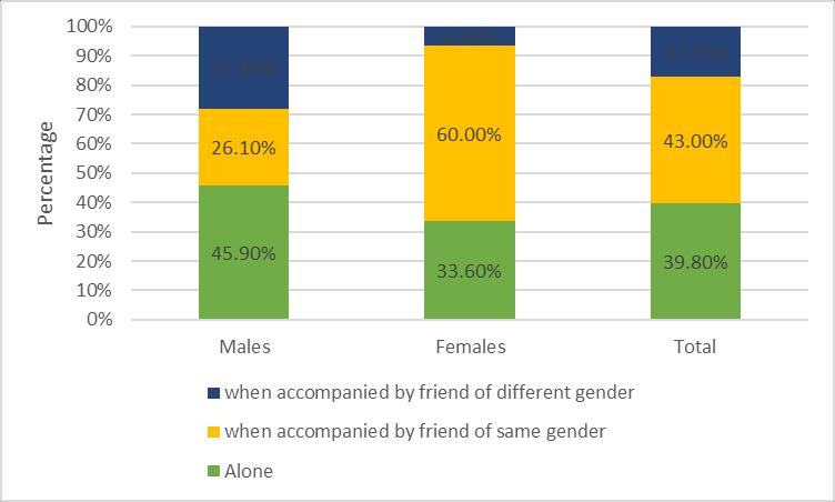 Anothersignificantdifferencewasobservedinthefactthat, mostwomenshoppedmorewhentheywereaccompanied by a female friend. While most men shopped more when they were alone as seen in Figure. 5. Most participants shoppedmorewhenaccompaniedbyfriendofsamegender. Higher percentage of women shopped more when accompanied by friend/friends of same gender whereas higher percentage of men shopped more when they were alone. However, there was a significant association of shoppingfrequencyandgender.(χ2=31.792,p=0.000).Thus, hypothesis H1 may be accepted. There is a significant difference between shopping behavior of undergraduate menandwomeninIndia.