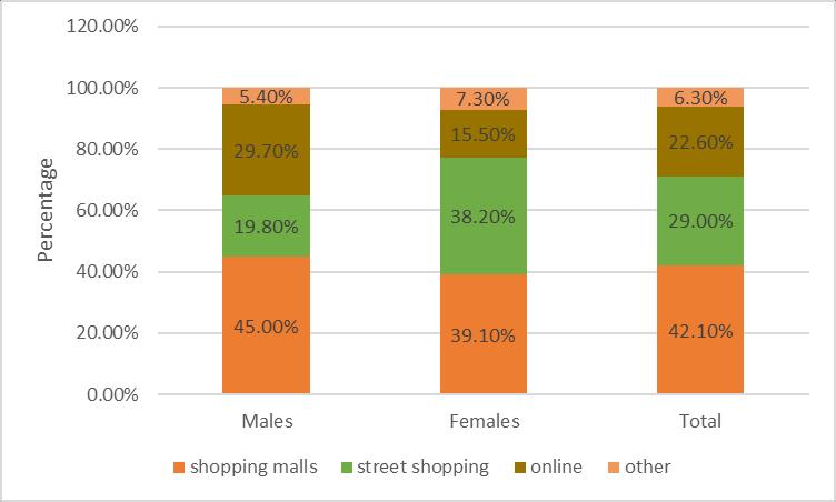 there is significant gender disparity for online shopping. Pradhana,F.andSastiono,P.(2018)foundthatwomenenjoy onlineshoppingmorethanmenbutthepresentstudyfound asseeninFigure.2,thatmenpreferonlineshoppingmore than women. Most participants preferred shopping malls, whereas very small percentage preferred online. Higher percentageofwomenwerestreetshoppers;whereashigher percentage of men shop online. There was a significant association between genders with the place of shopping (χ2=12.178,p=0.007).