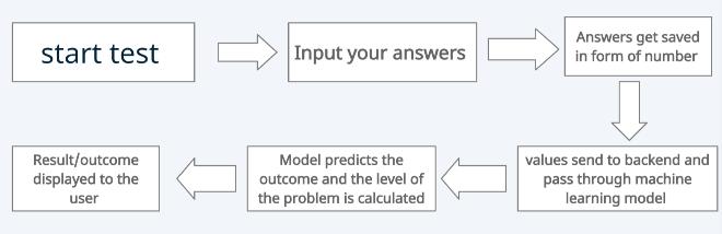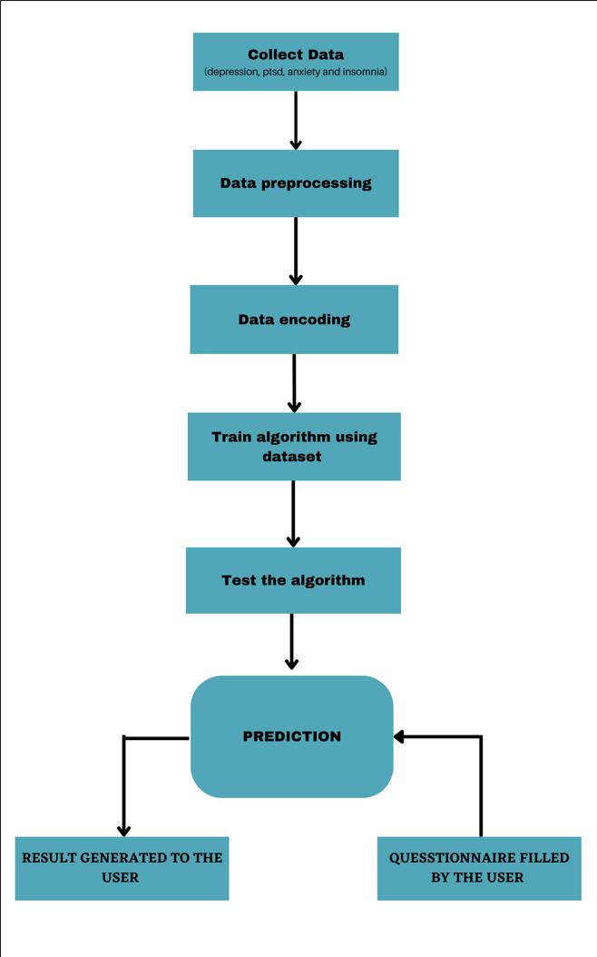 The initial step is data collection. We have tried to collect data fromdifferentplaces.Therewasnostandarddataset availablewhichcouldmatchourrequirements.Hence, we hadtocollectallthedataourselves.Wemadeasurveyform foreachdiseaseanddistributed,bothonlineandofflinefor peopletofill it.Thenature ofourquestionswasobjective andsituational.Wealsoincludedpeoplewhoarecurrently suffering from some kind of mental illness and are seeing doctorsforitandtakingsomekindofmedications.Oncethe data collection is done, the user's response is converted usingnumericvaluesof0to3,andinsomecases0to4.Once we had enough data collected, it was moved to preprocessingandissplitintotwosubsetsi.e.,trainingand testdatasets.