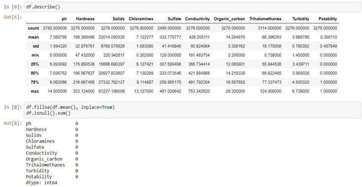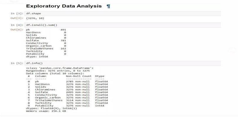ExploratoryDataAnalysisshouldthenbedone.Checkthe dataset'sshapefirstinEDA.Checktoseeifthereareany NULL values, as you can see in the image below for ph, Sulfate, and Trihalomethanes. then verify the dataset's information.