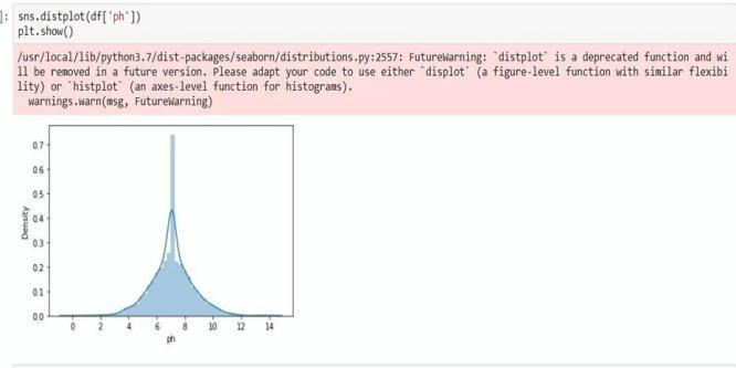 To determine whether the pH value has a normal distributionornot,depictitusingthedistplotfunction. Sinceitisanormaldistribution,youcanobservethat.