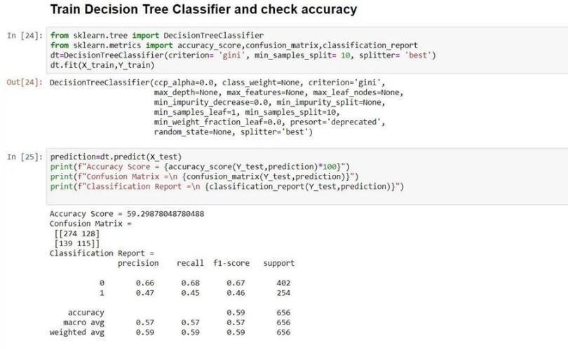 It's time to assess the model using the classification report, confusion matrix, and accuracy score. The actual data and theexpecteddata arethetwoparametersused inevaluationmethodologies.Andyoucanseethat59%of thetimeisaccurateoverall.