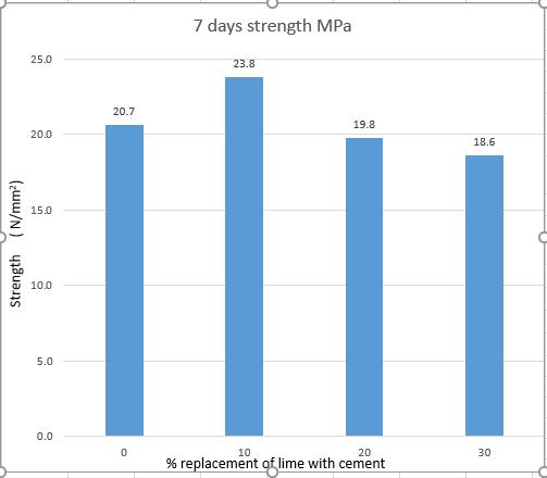 FromtheaboveFigure6,thecompressivestrengthof limeconcreteat7daysstrengthcanbestudied According to the graph above, when lime is added up to 10% by weight of cement, lime concrete has an optimum compressive strength of 23.8 MPa. When lime content exceeds10%,compressivestrengthgraduallyfalls.