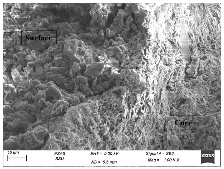 Inthenextfigures17,18and19,wecouldseethatITZ almostoverlapswiththeartificialaggregatesurfacebecause of the pores and the sinuosity in the surface of aggregate mainlyformedbythereactionbetweenSodiumhydroxide andsodiumsilicateinthecoldbondedprocessbesidesthe cement hydration process outputcalcium hydroxide could interact with the raw material we used in producing aggregate.