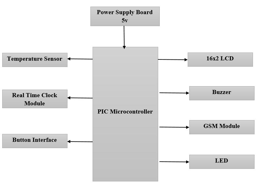 Thecircuitincludesamicrocontroller,LCD,regulator,driver IC, RF transceiver, crystal oscillator, capacitors, and a transformer.Italsoincludesbloodpressure,heartrate,and temperature sensors. The microcontroller has 28 pins in total. The microcontroller has three inputs. They are the temperature, heart rate, and blood pressure sensors. The microprocessorPIC18F25K20hasabloodpressuresensor linked to pin 15, a heart rate sensor to pin 3, and a temperature sensor to pin 2. The LCD is attached to the microcontroller'soutputpins22through26.TheDRIVERIC isattachedtopins11,12,and13.MAX232iscoupledtopins 17and18.