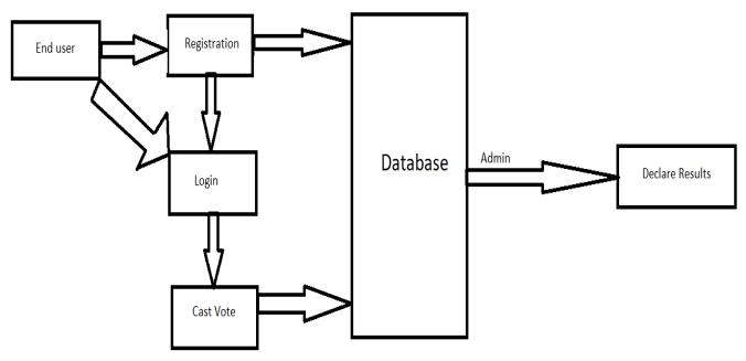 Thisonlinevotingsystem,whichthevotercanusetologin and execute his voting rights, will be used to handle the voter'sinformation.Allofthevoter'sdataissavedinfullina database that is kept up to date by the INDIA ELECTION COMMISSION.Atthetimeofregistration,votersmustsupply theirfullname,age,Aadharcardnumber,mobilenumber, emailaddress,andfingerprints.Theinformationwillalsobe checkedbytheadministrator.Whenrequestingtovote,the voter must enter his Aadhar ID. After the voter has been confirmed, they are free to vote for any of the listed candidates.