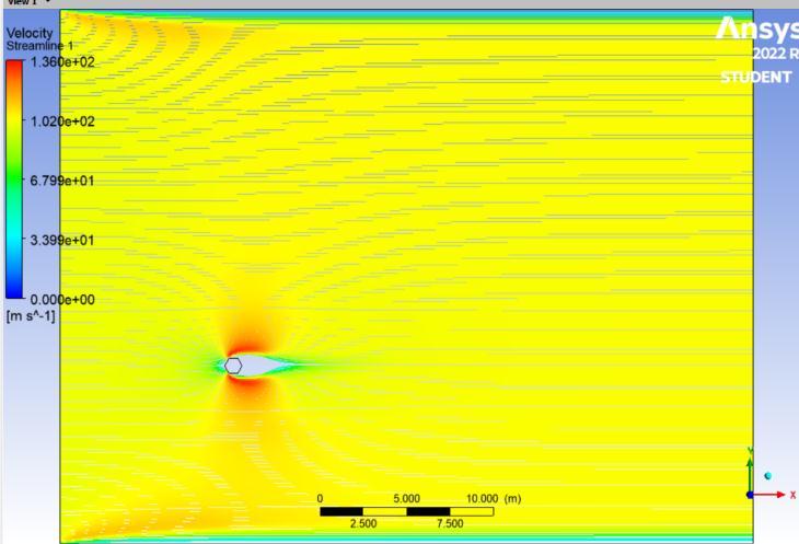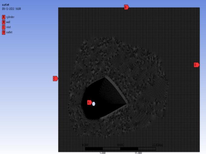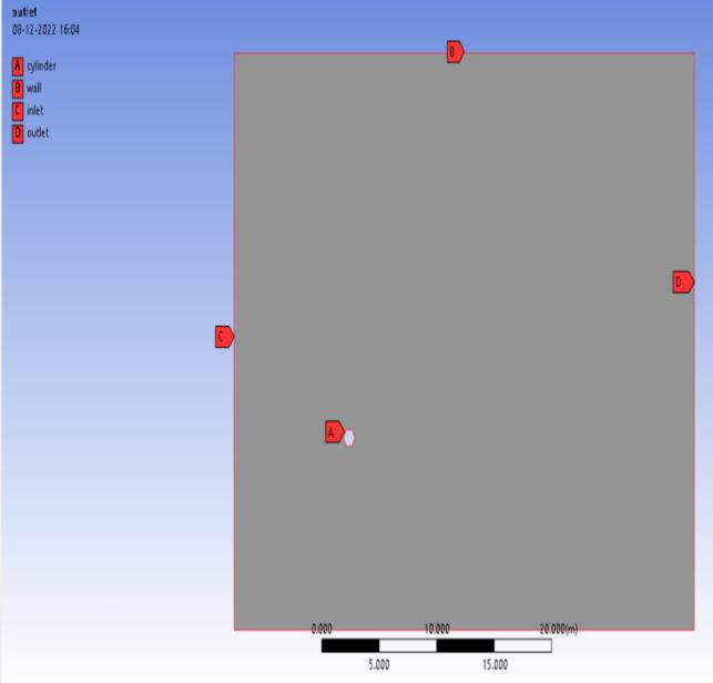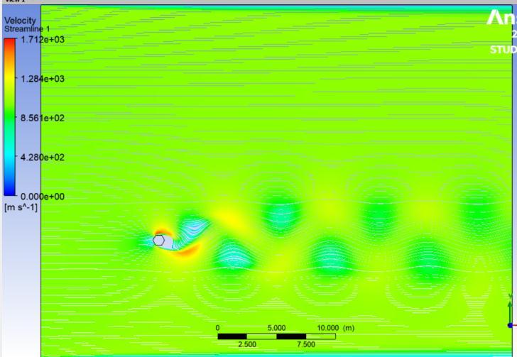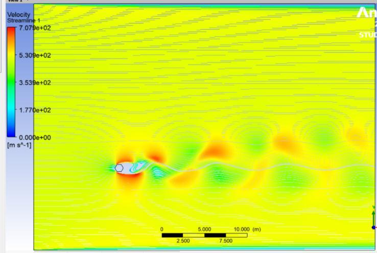 The direction of fluid flow is in the positive X-direction, i.e from left to right. There is a specified uniform inflow velocity u =u0 selected in accordance with the Reynold number .After that, the system is resolved utilising the formulas of (SST k-) turbulence model. The NavierStokes equations in 2D incompressibility are the governing equations. The computational domain identifiestheamorphoussettinginwhichthesolutionis computed.Itismadeupofawall,ahexagonalcylinder,a velocityentrance,andapressureoutlet.