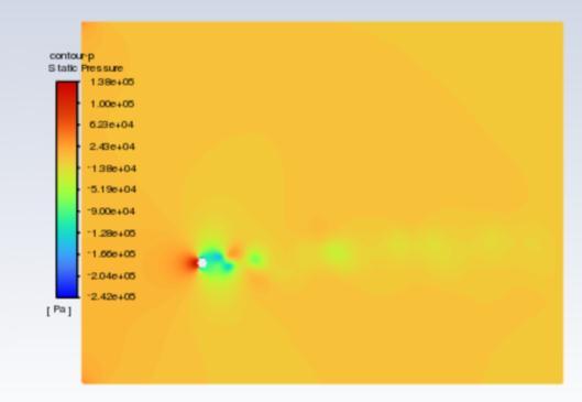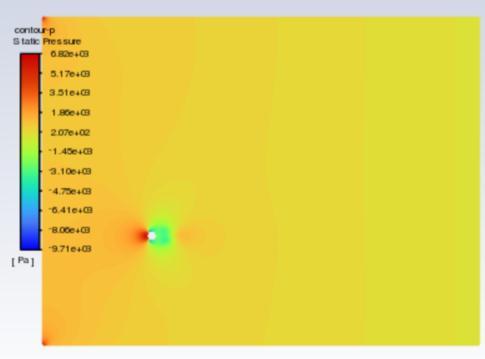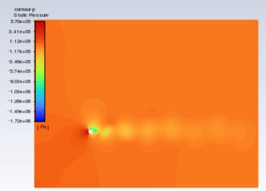 The velocity contours are represented in figures 5 to 7 , whereas pressure contours are represented in figures 8 to 10 . When used to visualise the flow in 2D, velocity contours make it simple to grasp how the air is moving around the cluster of cylinders and how its velocity is changing The pressure contour allows one to comprehend the coefficient of pressure distribution visually. for the hexagonal cylinder for Re =100,500 and 1000respectively. Accordingtothescaleon theleft, the colours red and orange denote higher pressure, while the colours green, yellow, and blue denote relatively lowerpressurezones.