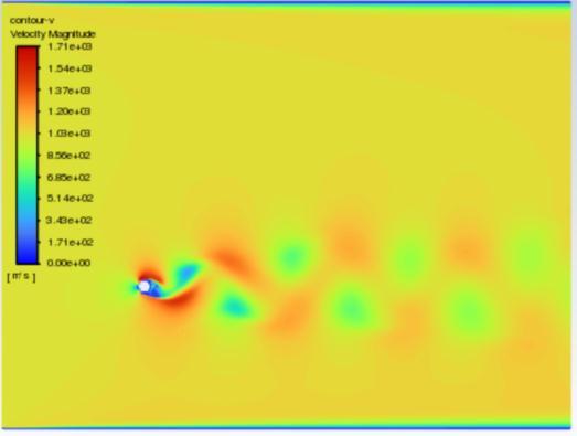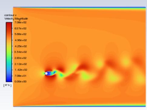 VonKarmanVortex:-Thedragandliftforceexertedby the fluid on the cylinder, are often separated. Reynolds numbers above 40 cause the flow to oscillate and cause vortexshedding.Becauseoftheperiodicvariationinthe pressure field surrounding the bluff bodies, the force components also start to follow a predictable pattern. The drag and lift forces can be further separated into mean and fluctuation parts for analytical reasons. Whearas meandragcoefficientCD variesaboutitsmean value and has a fixed value. In contrast, the mean Force of lift varies around 0 and mean lift coefficient CL is nil andvariesveryless.