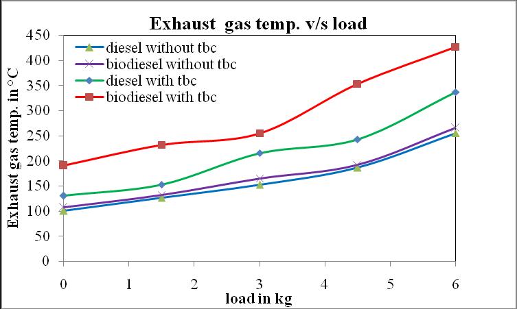 Inchartno.3 exhaustgastemp.v/sloadat200barinjection pressure with and without TBC. Here exhaust gas temperature of diesel is less when compared to transesterified Pongamia oil. Exhaust gas temperature of diesel without TBC is 4% less as compared to that of Pongamia oil without TBC at 80% load. Exhaust gas