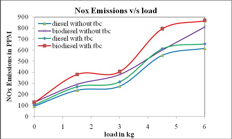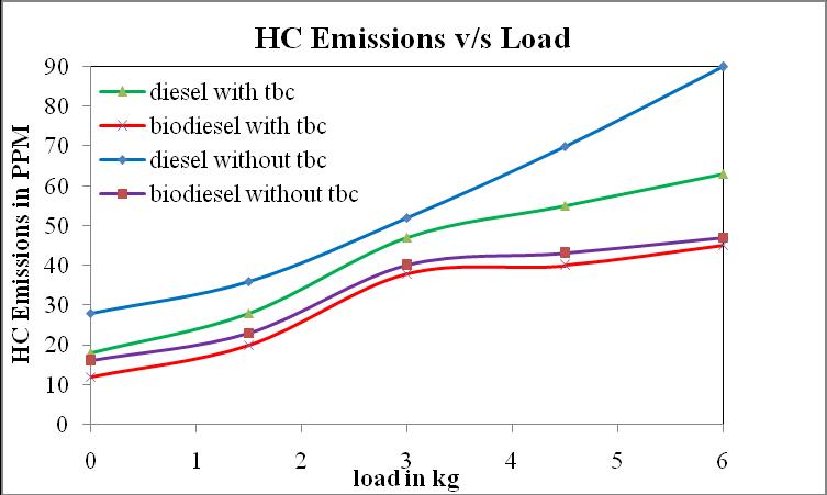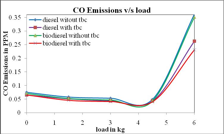 CO emissions of biodiesel are reduced by 27% when comparedtodieselwithoutTBC.COemissionsofbiodiesel with TBC are also reducedby 34% as compared to that of diesel with TBC at 80% load show in the chart no. 6. The reason of less CO emissions is that biodiesel have extra oxygenmoleculeascomparetodiesel.