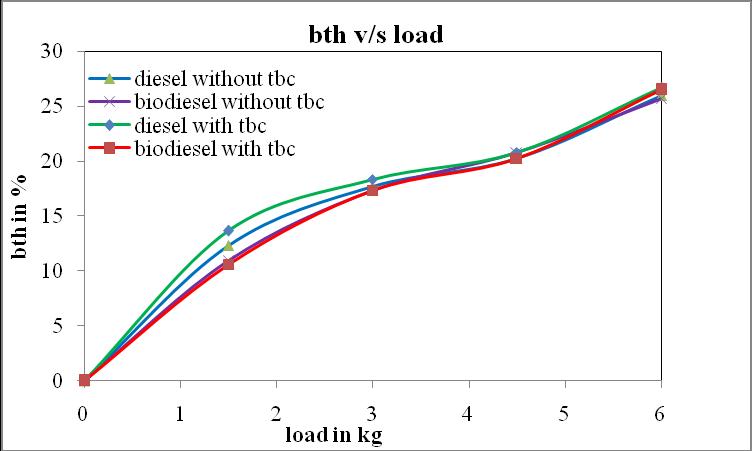 InChartno.7and8showtheusefulheatenergyandheat lostthroughvariousmeans.Withtheapplicationofthermal barriercoatingonthepistoncrown,heatlosstothecoolant water was reduced dramatically compared to standard diesel engine.Ithasbeenobservedfromtheteststhatthe heat equivalent of brake power is higher to biodiesel compared to the diesel engine. This is due the complete combustionofthefuelandreducedfrictionallosses.