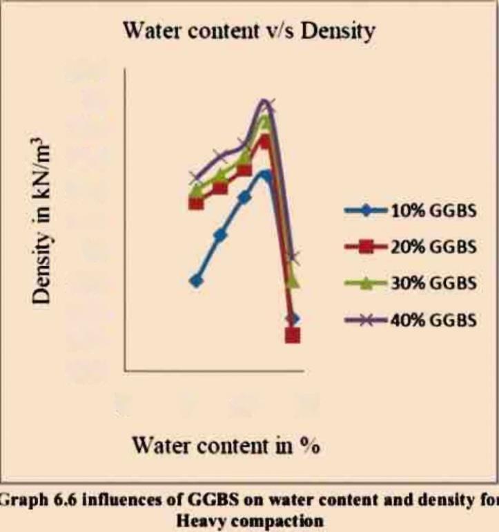 Thedifferentnatureofgraphsshowstheinfluenceofdifferentamountofstabilizer(GGBS)onthewatercontentanddensity ofthesoilforheavycompactiononthesoil.