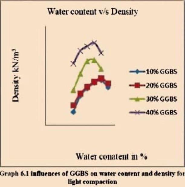 The different nature of graphs show the influence of different amount of stabilizer (GGBS) on the water content and densityofthesoilforlightcompactiononthesoil