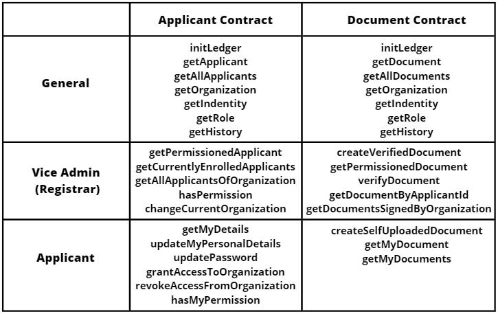 Therearetwocontractsimplementedforour system considering two assets, i.e the applicant and the document which will be transferredortobemorespecificwhosedata will be changed. Below are the chaincode functionsofthetwochaincodes.
