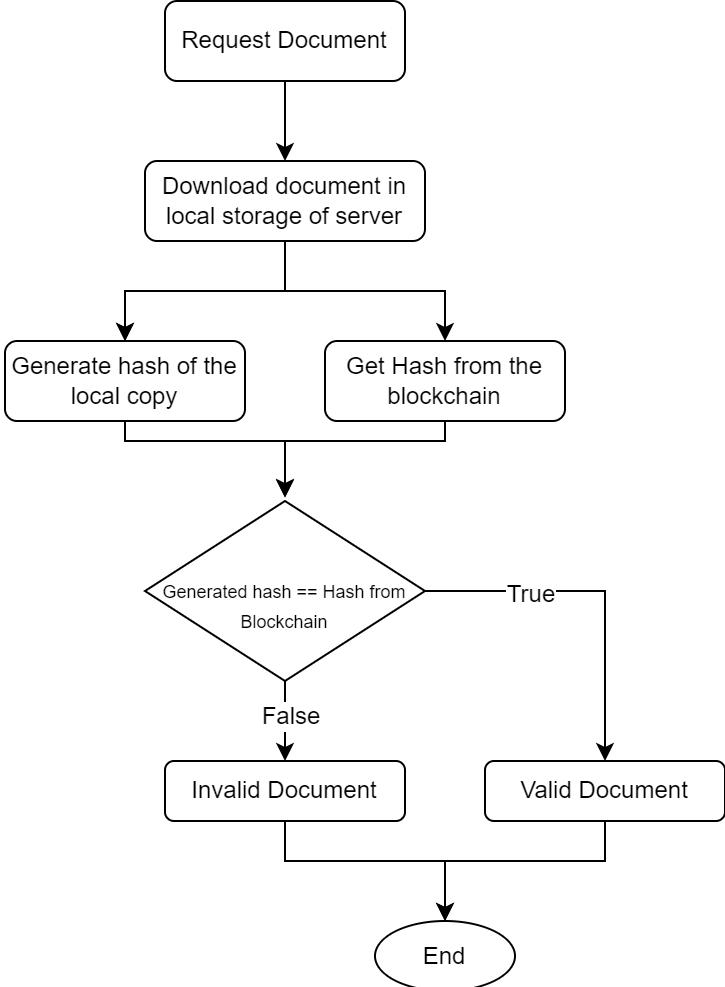 Once the document is uploaded in the distributed secure storage, everytime the documentisaccessedthedocumenthashwill be generated and compared with the hash retrievedfromtheblockchain,thus,ensuring that even a single pixel isn’t changed of the document. This provides a secure and effortless way of managing, storing and retrievingthedocuments.