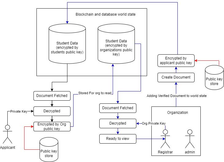 Despite the fact that blockchain is a highly effectivetoolfordatapersistenceandsecurity, there is still an issue. Everyone in the consortiumhasacopyofthedata,aswellas theblockchain,whichhasallofthetransaction detailswiththeinformationoftheapplicant filledin.Wearestrivingtoremedythisissue, sothedataisonlyavailabletothosewhohave permission to see it. This is accomplished through the use of public and private key cryptography.Thedataisencryptedusingthe applicant'spublickey,ensuringthatonlythe applicant with the private key may decrypt andviewtheinformation.