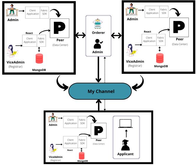 In the network representing our system, every single organizationmustcontaincomponentslikepeer,FabricSDK server,aclientapplication,apersonalizedMongoDBdatabase in order to store the registration details as well as for authenticationandauthorization. Theremustbean administratorwhichrepresentstheorganization,aregistrar. The admin representing the organization receives the configurationdetailsandkeysfromthemembershipservice provider. He can then manually set up the peer node. The peercanbeconsideredasaserverordatacenterwhichholds all the databases, chaincode, certificate and every other necessaryconfiguration.Theprocessofconfiguringthepeer nodeisaonetimeprocess.Hecanalsoregistertheregistrars usingtheclientapplicationprovided. Theregistrarscan be considered as one or more persons who manage the documentsonbehalfoftheorganization.Theregistrarsare alsoprovidedwithaclientapplicationwhichallowsthemto perform various operations like login into the system, sendingandverifyingthedocumentsetcasdiscussedabove.