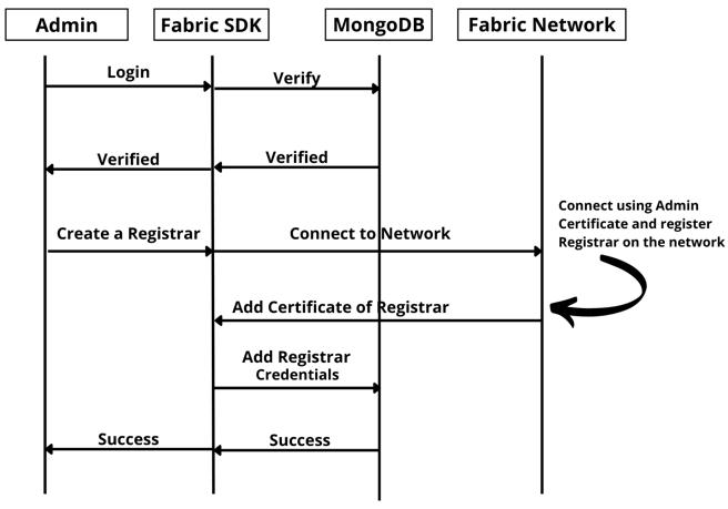 Theadminiscreatedforalltheorganizations thatjointhenetwork.AdminscancreateVice Admins (registrars) for their organization. Admintriestologin,itsrequestgoestoFabric SDK, then the login credentials are verified through Mongo Database. If the credentials arevalidtheadminloginssuccessfully.After theadminiscreatedandadminlogintothe network, admin can create a registrar. He enters the details of the registrar, through fabric sdk tries to connect to a network via gateway.Afterconnectingtothenetwork,the adminconnectstoachannelandregistersthe registrar.Thewalletandx509certificategets created for the registrar and the registrar credentials is inserted into the mongo database.