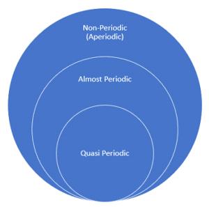 This specific definition of a periodic function sets the conditions to define an aperiodic function: An aperiodic (or non periodic function) is any function that isn’t periodic, and as such, any measured signal can be described in terms of being periodic or aperiodic. A variant on this definition is one provided by Adams [1]: Although an aperiodic function isn’t not periodic in nature, there is a very close relationship: mathematically, you can think of them as periodic functions with a period of infinity Notethatthereare(atleast) twosubclassesofaperiodicfunctions,thosebeing:(1) Almost-periodic functionwhich,although notperiodicthemselves,canberepresentedbyasumoftwoormoreperiodicfunctions;and(2) Quasiperiodic functionswhich are a combination of periodic functions of different frequencies that never completely match up. These classes of aperiodic functionsareillustratedinFigure2.