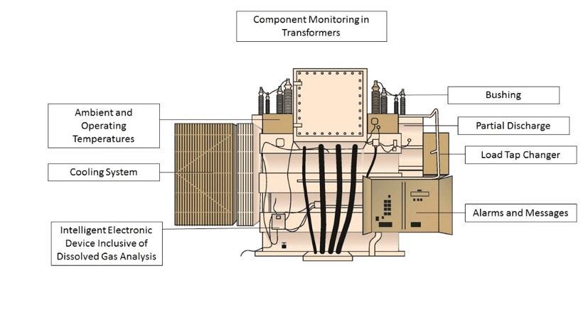Functional Performance of Assets: As illustrated for a large electrical transformer, Figure 3, the parameters to be monitored for function performance are largely electrical properties such as voltage, current, phase angle, and frequency. These