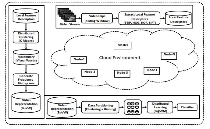 Fig.4.Block diagram ofvisual big data framework over thecloud for traffic monitoring withthehelpof large surveillance camera network ofa smart city.Illustrationofdistributedprocessing offeature representationusingbag-of-words(BoW) andclassification usingdistributedsupportvectormachine(SVM).