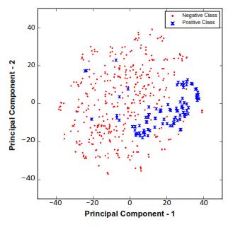 Fig. 2. HOG feature vector visualisation for the t-SNE classification of "bike-rider vs. others" [13]. The bike-rider class is represented by a blue cross, whereas the non-bikerider class is represented by a red dot. [Best viewed in color]