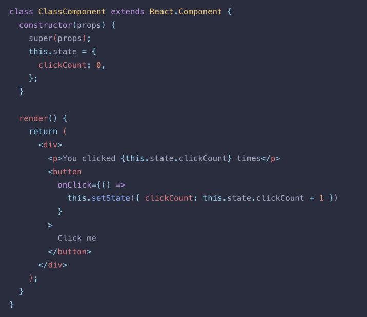 the states and updating or rendering the components impactedbythosestates.Acomponent'sstateneedstobe updatedwheneveroneormorevariablesinthecomponent update. It is here that the useState Hook shines. Let us compareastateimplementationinaReactclasscomponent andafunctionalcomponent