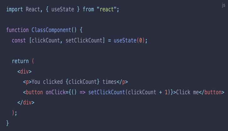 TheuseStateHookreturnstwovalues:theexistingorthe currentvalueandasetterfunctionthatsetsorupdatesthe state.Hence,thesyntaxdepictedin Figure 8 relatesdirectly to the class example shown in Figure 6 with this.state.clickCount and this.setState. With this