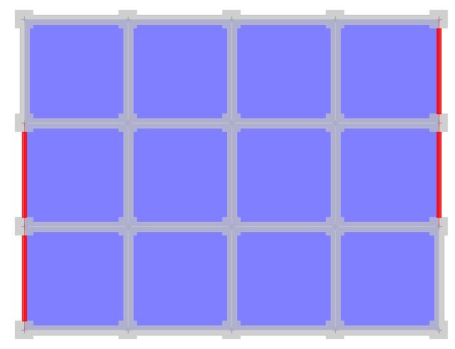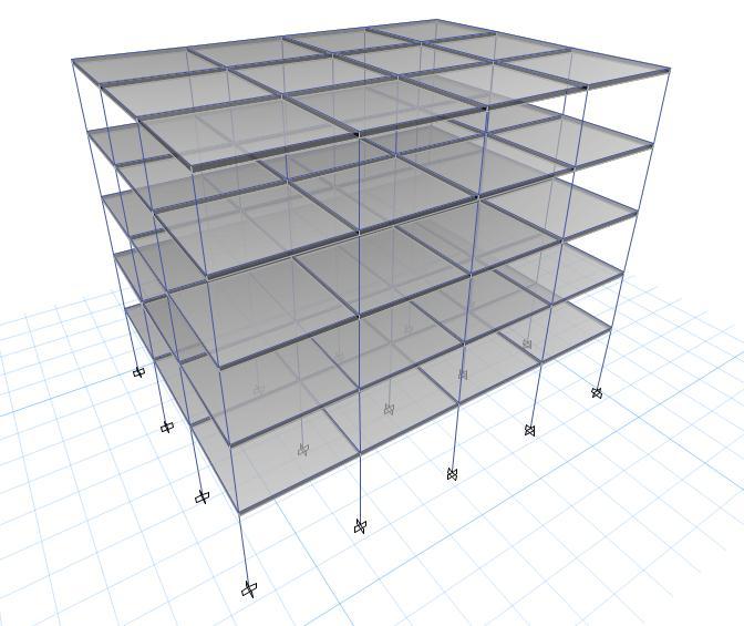 diagramshowsthatthebuildinghasfour3.2-m-highstories (this height does not include the ground level). The walls' weight is regarded a homogenous load on the beams, althoughtheyarenotdepicted.Modelusesfixedsupports. Thisisanassumptionmadetodeterminehowthegroundfloor columns are connected. Any fixed support is 0.00 m belowground.