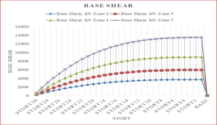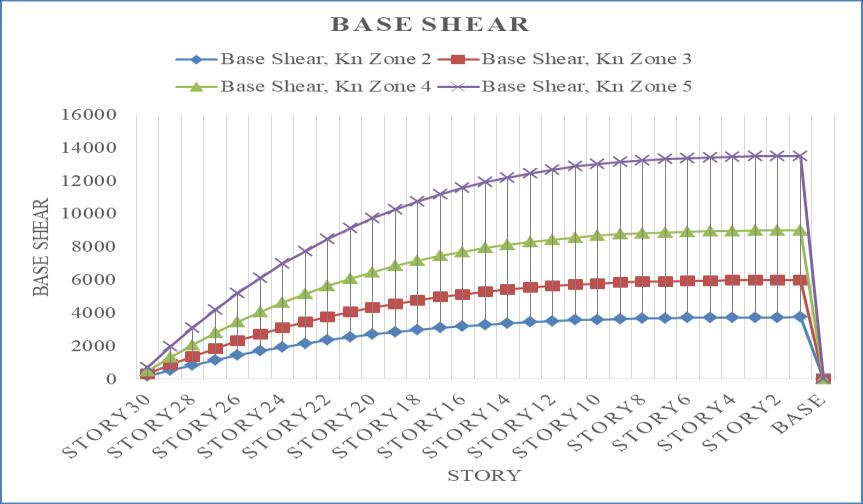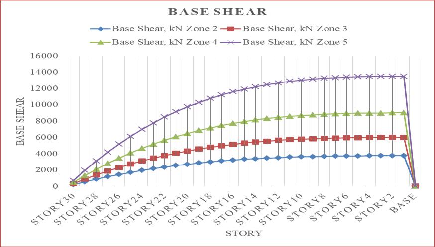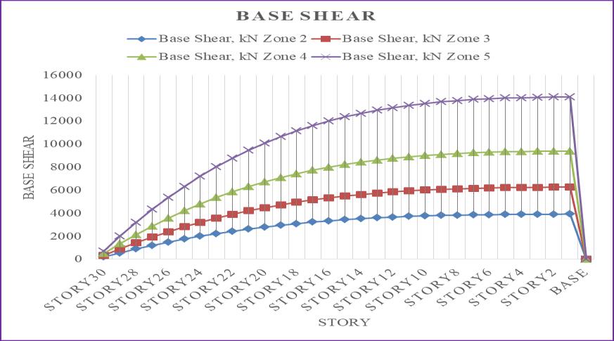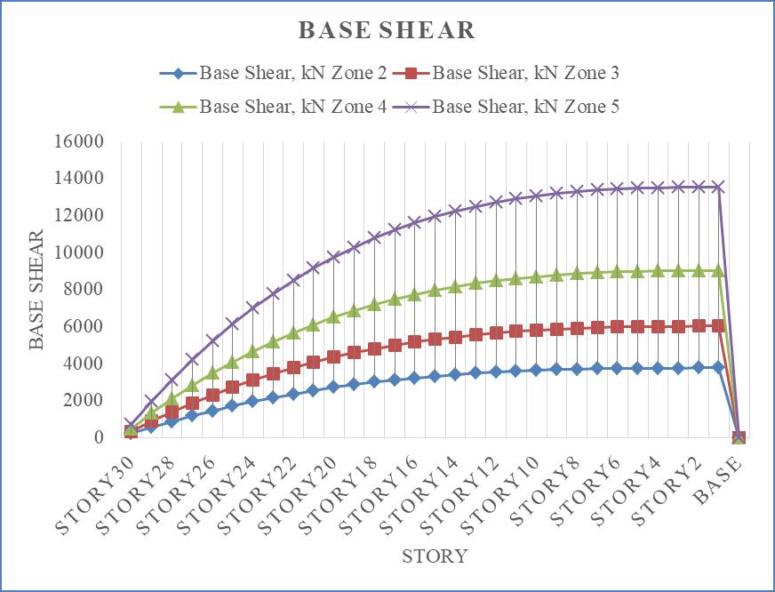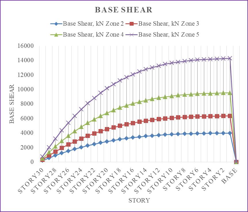 Ascanbeobservedfromtheabovechart,baseshear increasesalongwiththeseismiczoneintensity,withseismic zone5experiencingthehighestbaseshear.Incomparisonto seismic zone 2, seismic zones 3, 4, and 5 see increases in baseshearof37.5%,58.33%,and72.22%.Fornarrative1, thebaseshearistakenintoaccount.