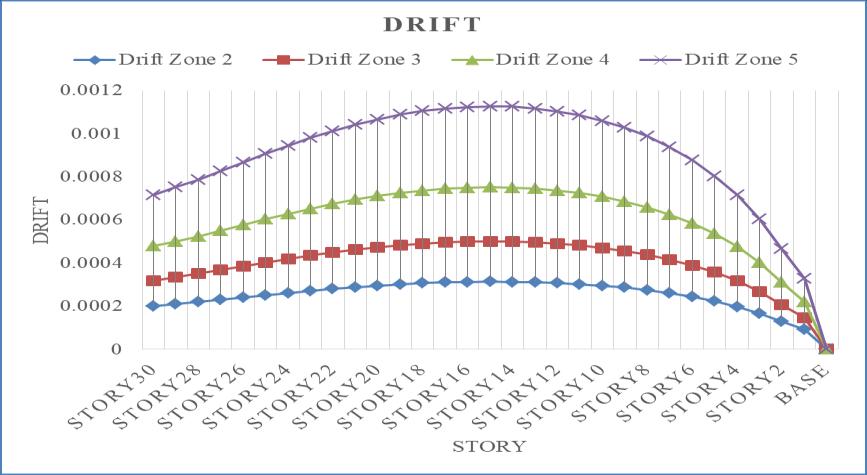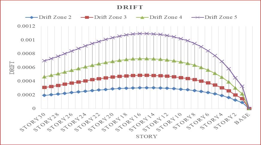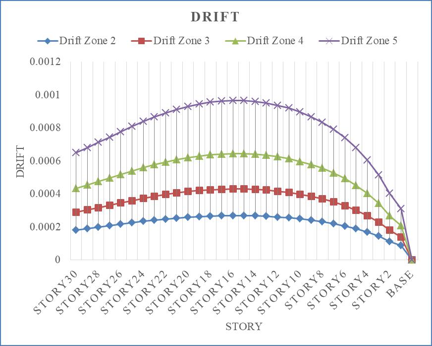 Ascanbeobservedfromtheprecedingimage,drift increasesalongwithseismiczonestrength,reachingitspeak in seismic zone 5. In comparison to seismic zone 2, the seismiczones3,4,and5haddriftincreasesof37.52percent, 58.32percent,and72.22percent,respectively.Thedriftis takenintoaccountfornarrative15.Whencomparedtothe otherstoriesoftherigidframetallskyscraper,story15will experiencethegreatesttaledrift.