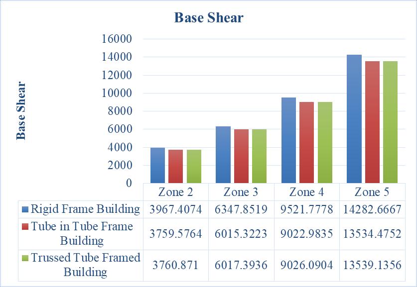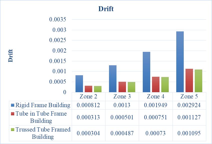 Throughouttheseismiczone,thetrussed frame building exhibits the greatest reductionindriftwhencomparedtorigid and tube in tube frame buildings. For all seismic zones, there is a continuous reduction of 62.56% from rigid frame to trussed frame construction. There is a continuouspercentagedecreaseof62.56% fromtherigidframebuildingtothetubein tube framed building, and there is a constantdecreaseof2.87%fortubeintube framedbuildingsandtrussedtubeframed structures.