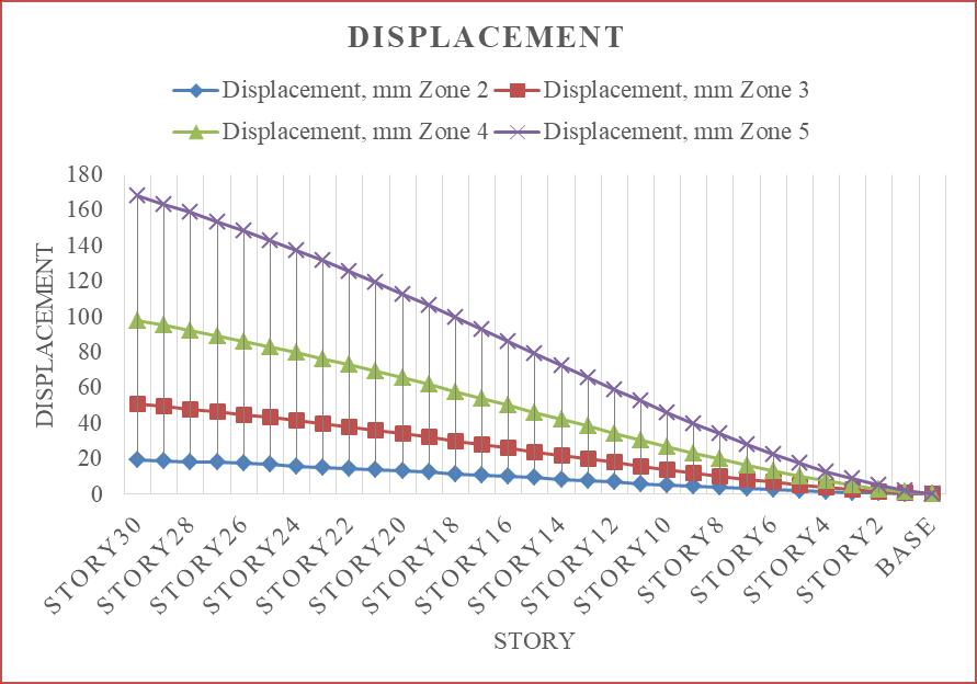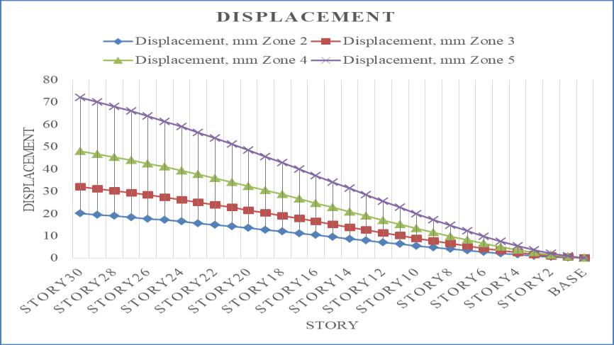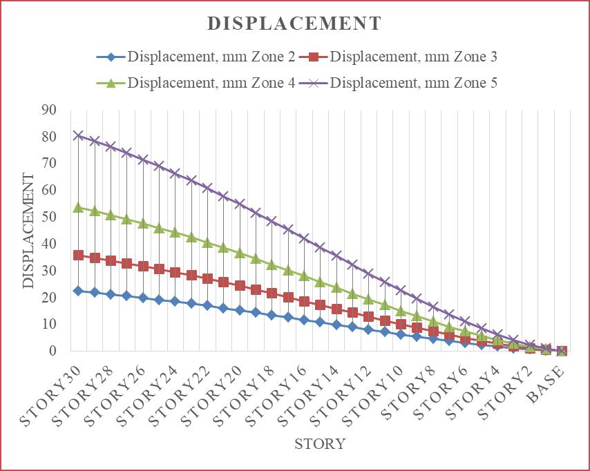 Thedisplacementincreasesalongwiththeseismic zoneintensity,asseenintheabovefigure,andthehighest displacementwasrecordedinseismiczone5.Incomparison to seismic zone 2, displacement has increased by 37.5%, 58.33%, and 72.22% in seismic zones 3, 4, and 5. The top story'sdisplacementistakenintoaccount.