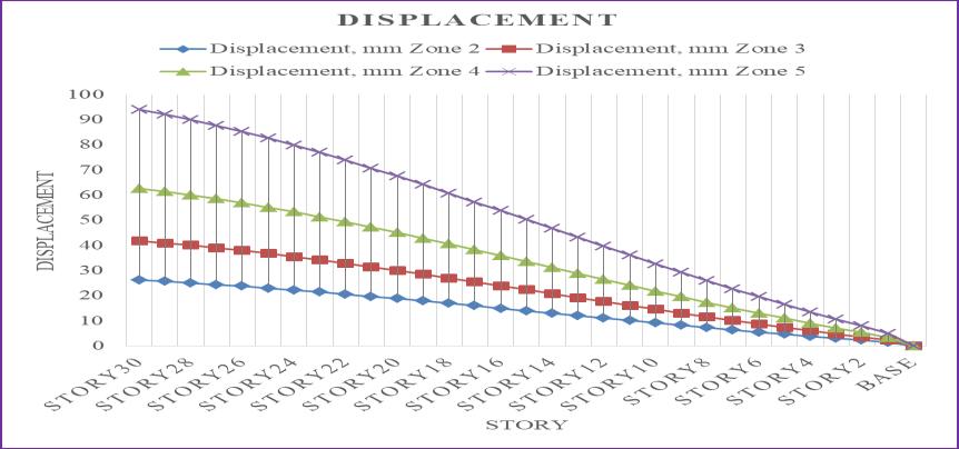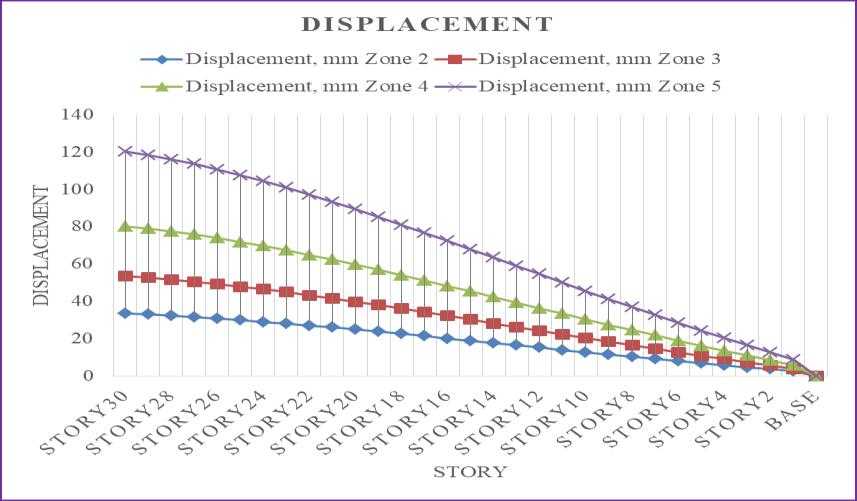 Thedisplacementincreasesalongwiththeseismic zoneintensity,asseenintheabovefigure,andthehighest displacementwasrecordedinseismiczone5.Seismiczones 3,4,and5showdisplacementincreasesof37.49%,58.33%, and 72.22% in relation to seismic zone 2. The top story's displacementistakenintoaccount.