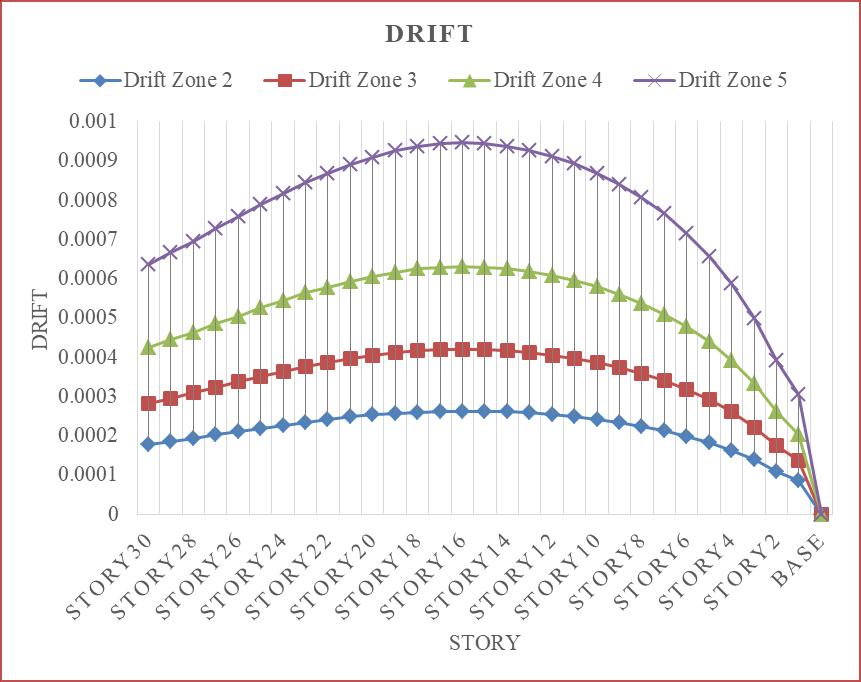 Ascanbeobservedfromtheprecedingimage,drift increasesalongwithseismiczonestrength,reachingitspeak in seismic zone 5. In comparison to seismic zone 2, the seismic zones 3, 4, and 5 had drift increases of 37.52%, 58.38%, and 72.25%, respectively. The drift is taken into account for narrative 15. When compared to the other stories of the rigid frame tall skyscraper, story 15 will experiencethegreatesttaledrift.