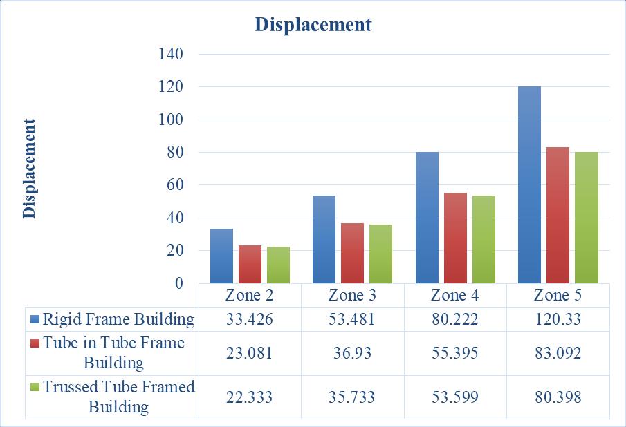 The drift for tube in tube framed and trussedframedbuildingsiscontinuouslyincreasing forbothseismicloadinx-directionandy-direction. Whencomparedtotheotherzones,zone2hasthe leastdisplacement.Whencomparedtozone2,there isaconsistentriseindisplacementof37.5%(zone 3),58.33%(zone4),and72.22%(zone5).