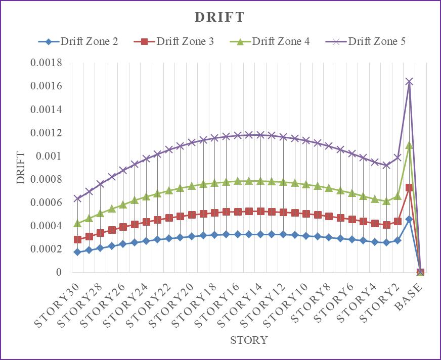 Ascanbeobservedfromtheprecedingimage,drift increasesalongwithseismiczonestrength,reachingitspeak in seismic zone 5. In comparison to seismic zone 2, the seismic zones 3, 4, and 5 had drift increases of 37.57%, 58.35%, and 72.23%, respectively. The drift is taken into account for narrative 15. When compared to the other stories of the rigid frame tall skyscraper, story 15 will experiencethegreatesttaledrift.
