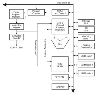 Arduino Atmega328 microcontroller as shown in figure is used to command the various components. The Arduino atmega328microcontrolleranditsarchitectureisshownin figure
