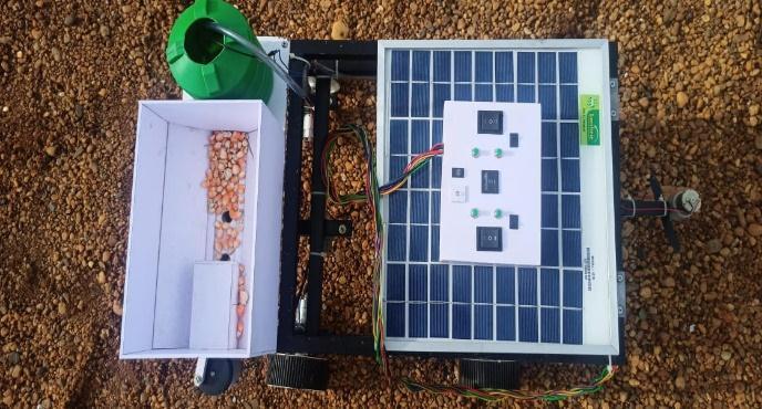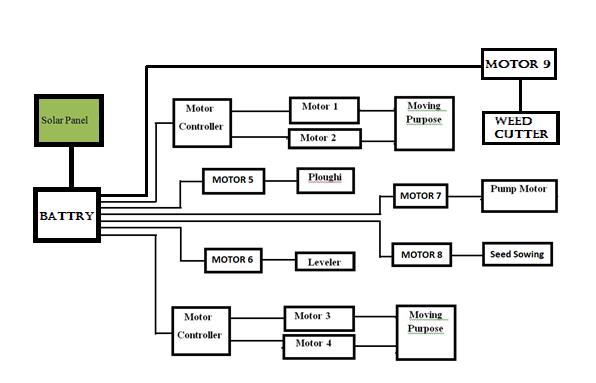 Thedesignedrobotwillperformtheseedsowing,pesticide sprayingandgrasscuttingoperationssimultaneously.When the solar panel gets heated it converts sunlight into electricity. This electrical energy is fed into the charging circuit. The pulsed voltage is given to battery in order to chargeit.Thechargingofbatteryiscontrolledwiththehelp ofvoltagesensors.Sincebatteryisbidirectionalitwillcharge andsupplyvoltagetoardunioatatime.Thevoltagesupply withsustainedoscillationisfedintoarduniowiththeaidof highpassfilter.Thechannelrelayprovidesvoltagesupplyto alldifferentmechanisms.Themotordriverisusedtodrive theDCmotorswhichruntherobot.