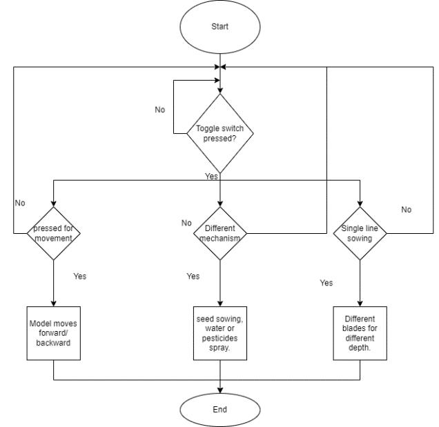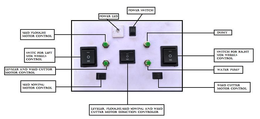 • Perform seeding: For placing the seeds instead of plowingthethreelines,onlythewaterpump,levellerwill work and other actions are not performed. To place the seedsonlyonebladeisusedtodiglandwithmoredepthof soil.Byusingtoggleswitchthelargebladeisusedtodigthe land.
