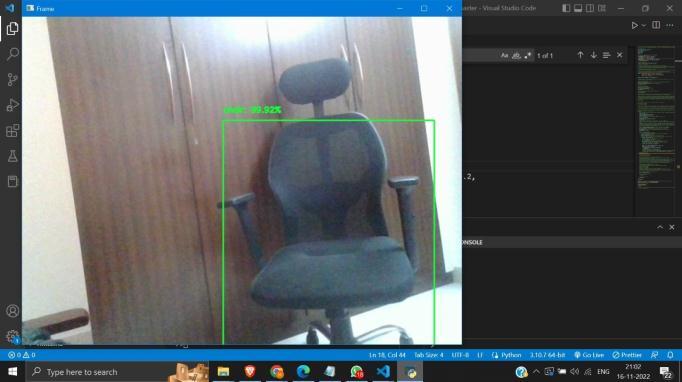 Asoutput,audiocommandsarecreated.Whentheobjectis tooclose,itdisplaysthemessage"Warning:Theobject(class ofobject)isveryclosetoyou.""Watchout!"Otherwise,ifthe itemisatasaferdistance,a voiceisgeneratedthatstates, "Theobjectisatasaferdistance."Thisisachievedthrough theuseoflibrariessuchaspytorch,pyttsx3,pytesseract,and engine.io.