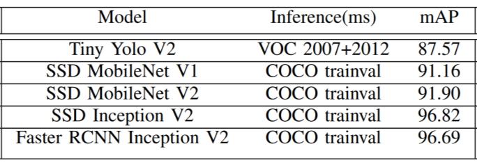 Table I compares multiple TenserFlow mobile object detection models in terms of inference time and performance. The models' mAP performance varies substantially,withthemorecomplexFasterRCNNInception modelachievingnear-optimalperformancebuttakingmuch longertoinferthanthelesscomplexTinyYolomodel.