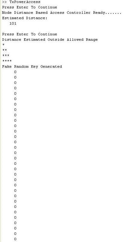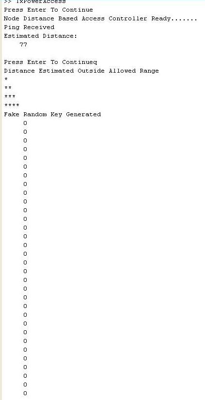 controllersentpingrequestcontinuouslywithincrementof somepowerwiththetimeintervalof10 seconds,after78 secondswith15mwpowerestimateddistancecalculatedby trainednetworkis77metersatthispointpingisaccept.But thisdistanceisnotinconvergerange,soaccesscontroller providesfakekeyforprivacyofnetwork.