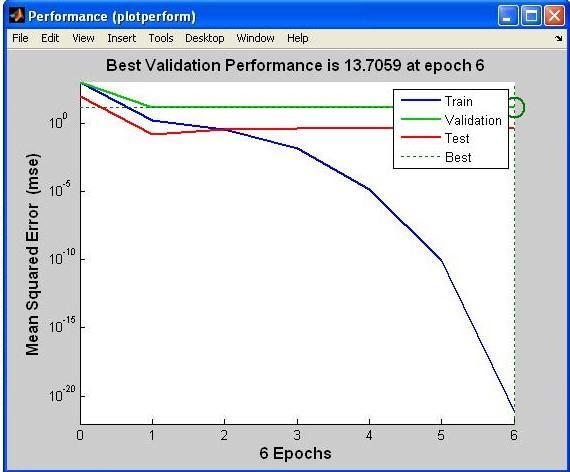 The accompanying diagram depicts the Artificial NeuralNetwork'sbestvalidationperformanceplot.Thebest, validation, test, and railway lines are all displayed here. Errortypicallyreduceswithadditionaltrainingepochsbut mayincreaseonthevalidationdatasetifthenetworkbegins to overfit the training data. Epochs with low validation errorsgetthegreatestresultswiththedefaultconfiguration afteraseriesofsixconsecutiveincreasesinvalidationerror.