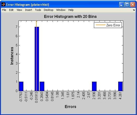 The error histogram plot produced by our neural networksimulationisdisplayedabove.Anerrorhistogramis a histogram of the deviations from the desired value, or forecast,thatoccurredaftertrainingafeedforwardneural network.Becausetheyindicatehowfartheprojectedvalues deviatefromthedesiredones,theseerrornumberscanbe negative.Thenumberofdiscretecategories(or"bins")ina barchart.Thehistogramisaformofbarchartthatdisplays numerical data by organizing it into discrete buckets. The error bars in the preceding graph range from a high of 0.01913at7instancestoalowof0.2843.