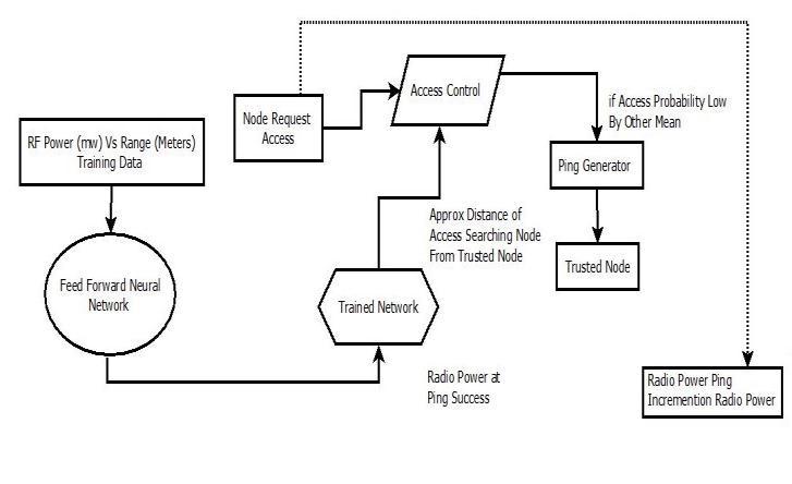 Apartfromtheauthenticationpathdescribedabove, another method of improving authentication score is provided, for User/Device denied access by marginal difference in authentication score, by verification of their physical/geographicproximitytothetrusted/centralnode using a novel technique developed using Artificial Intelligence & slowly increasing Transmit Distance by varying theRadioPowerusingTransmitPowerEstimation ANN, until ping is replied by the User/Device requesting access. After each ping, the pin generator increases the power by a certain amount until a node connects. Once a node does connect, the trained network calculates its distancefromanaccesscontrollerandprovidesakeyand someleniencyinaccess.Theaccesscontrollerwillprovidea false (fake) key if the neural networks calculated range is greaterthanthecoveragerange.Thisishowwe'llverifythe authenticity.