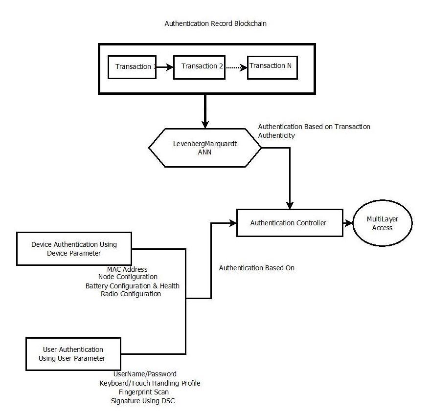 Block-Chain based authentication score is combined with User/Device authentication score using custom machine intelligencetogeneratefinalauthenticationscore,whichis usedtoprovidemulti-layeraccesstovariousservicesand resourceshostedbytheIOT–WSNNetwork.